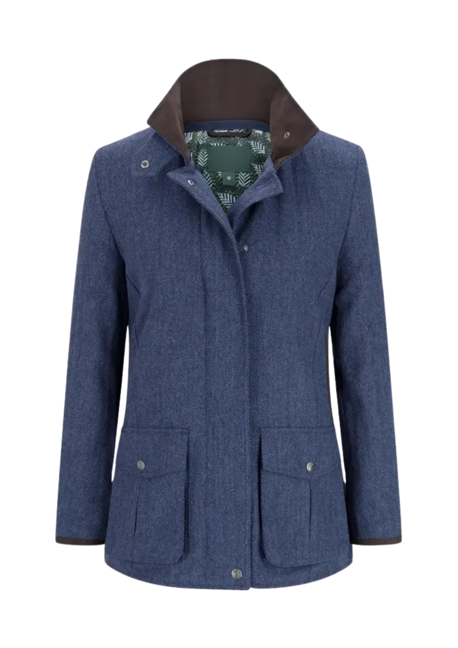 A sophisticated, traditional field or shooting coat featuring a distinctive blue herringbone tweed texture. The design includes practical features like multiple pockets and a protective stand collar with contrast detailing, positioning this piece for outdoor, heritage, and classic outerwear markets.