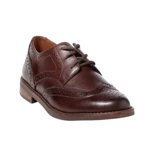A classic, formal lace-up brogue shoe crafted from smooth, rich brown leather. This shoe features traditional wingtip and decorative perforations (broguing) along the seams and toe cap. The sturdy sole and classic Oxford design make it an excellent choice for children’s/youth formal wear, uniforms, and premium footwear markets.