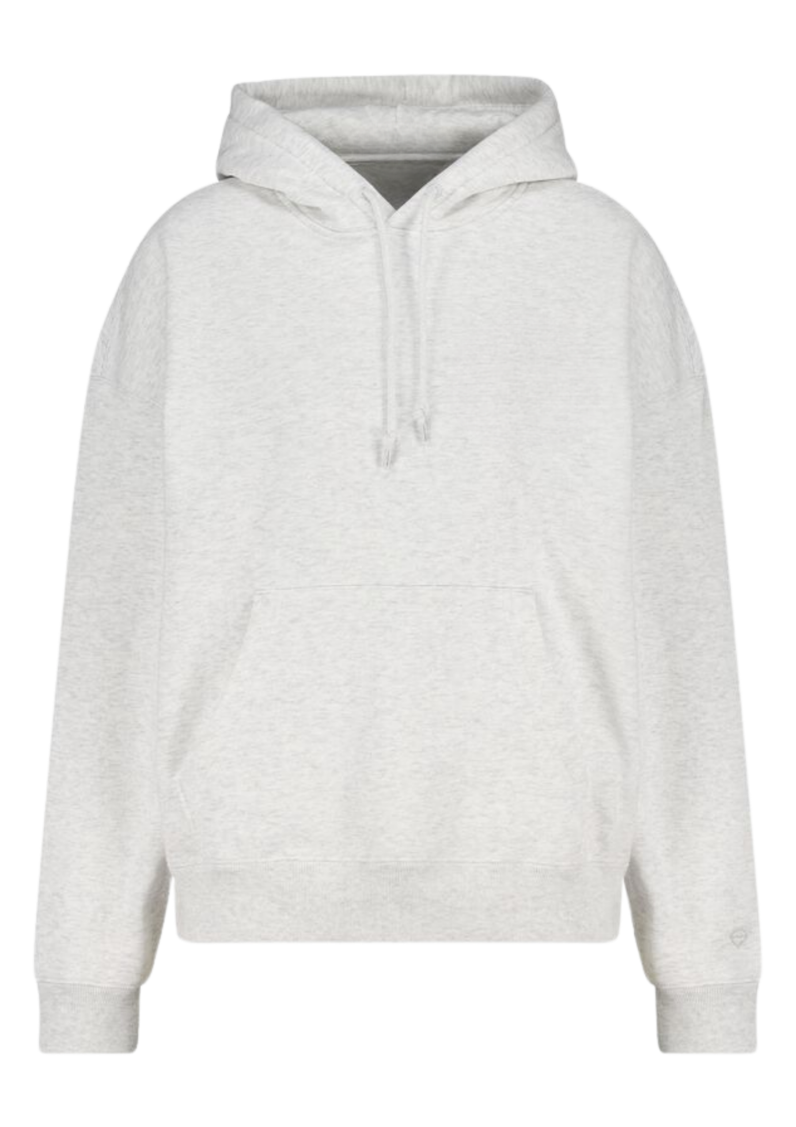 A core pullover hoodie in a versatile light grey marl (heather) color. Designed with a relaxed, slightly oversized fit, adjustable hood, and a large kangaroo pocket, this piece is a staple for casual, loungewear, and athleisure collections. It serves as a comfortable, high-quality basic suitable for branding or everyday wear.