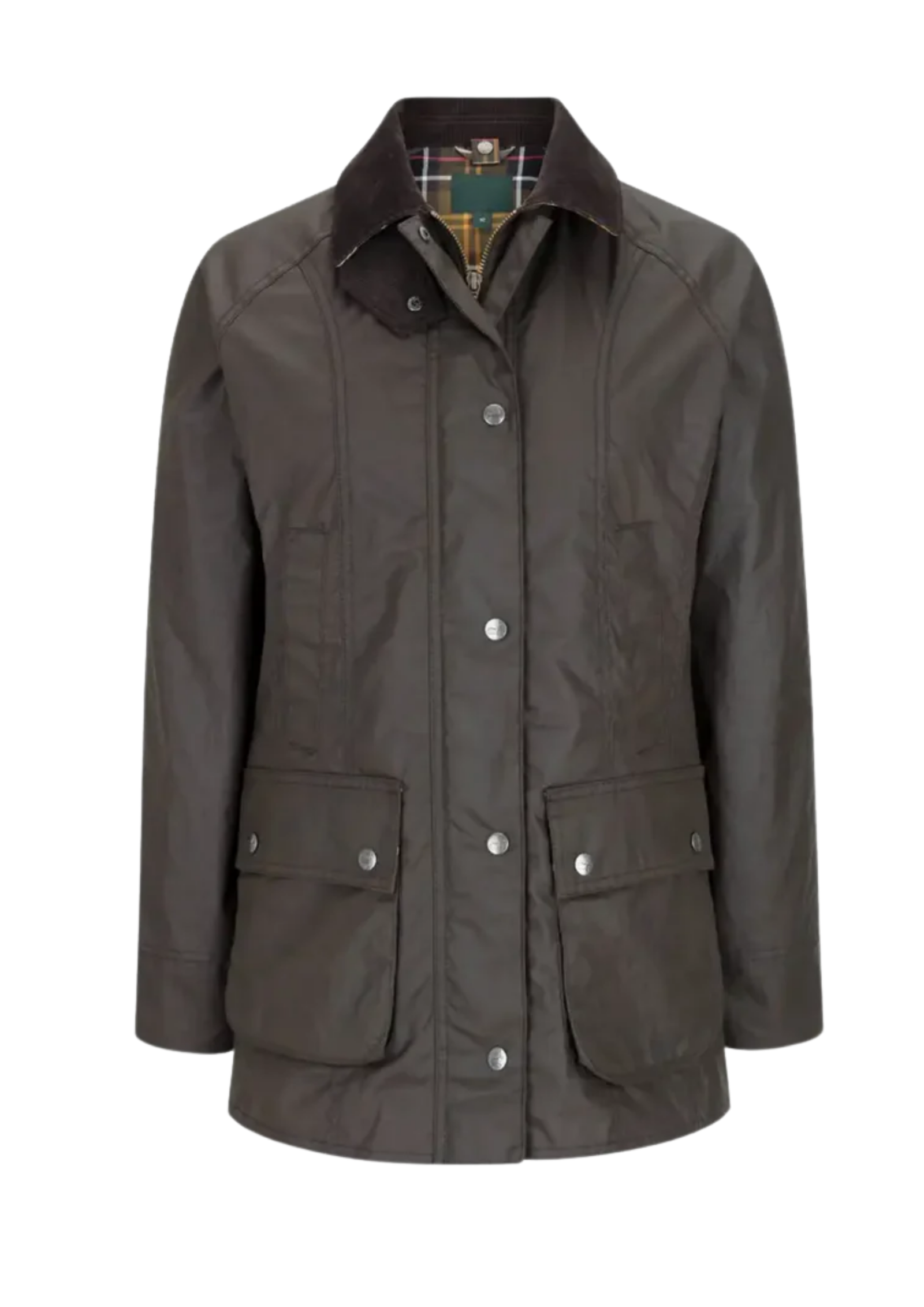A traditional, hip-length field or utility jacket in a deep, earthy brown, featuring a protective outer fabric and practical design elements. This iconic style, with its corduroy collar and tartan lining, is designed for durability and is a staple for countrywear, heritage, and classic outdoor markets.