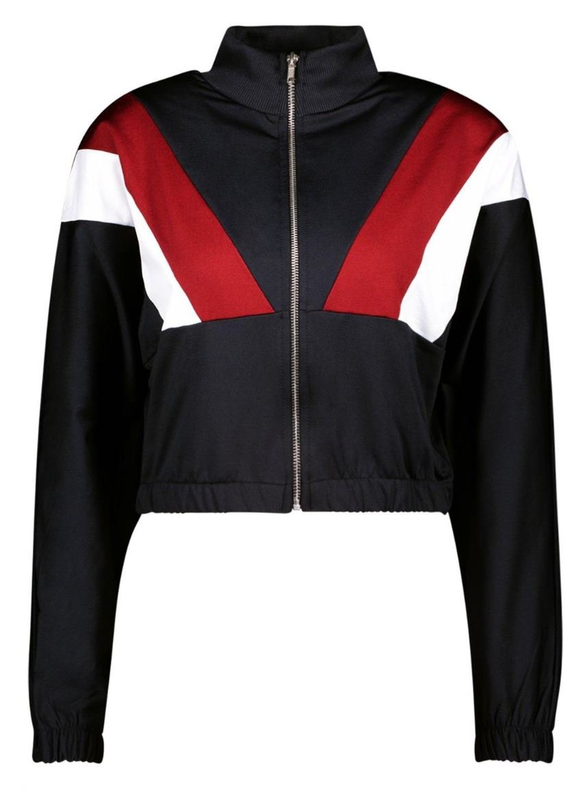 A stylish, full-zip track jacket featuring a prominent color-block chevron design across the chest and a trendy cropped length. Designed for the athleisure and casual sportswear market, this piece offers a lightweight layering option with a bold, retro-inspired athletic aesthetic.