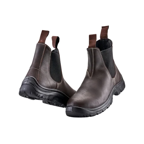 A pair of rugged, durable Chelsea or Dealer style pull-on boots crafted from dark brown genuine leather. These boots feature an industrial-grade black rubber safety/work sole and heavy contrast stitching. The strong construction and slip-on design make them suitable for workwear, safety footwear, and heavy-duty casual markets.