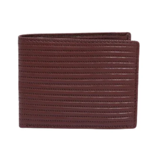 A classic bi-fold wallet crafted from brown genuine leather featuring a distinctive horizontal striped texture achieved through stitching or embossing. The rich brown color and subtle texture provide a sophisticated, contemporary twist on a traditional style. This wallet is a premium accessory suitable for men’s contemporary, textured, and luxury accessories markets.