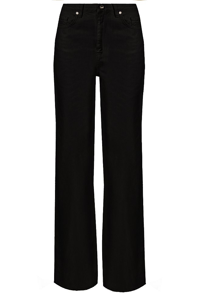 A pair of classic straight-leg trousers or jeans in solid black. Featuring a high-rise waist and a full-length cut, the clean design and dark color make these versatile for core casual, contemporary, and basic apparel markets.