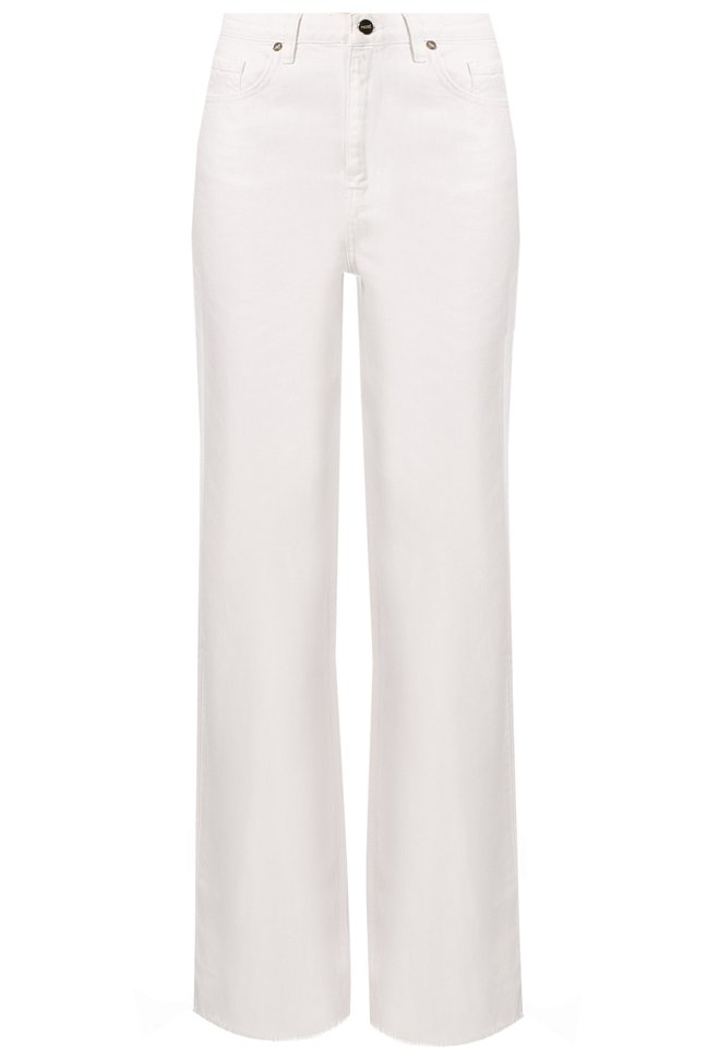 A pair of crisp straight-leg jeans in solid white, featuring a flattering high-rise waist. The silhouette is straight from the hip down, and the hem has a modern raw edge detail, making it suitable for resort, summer casual, and contemporary fashion markets.