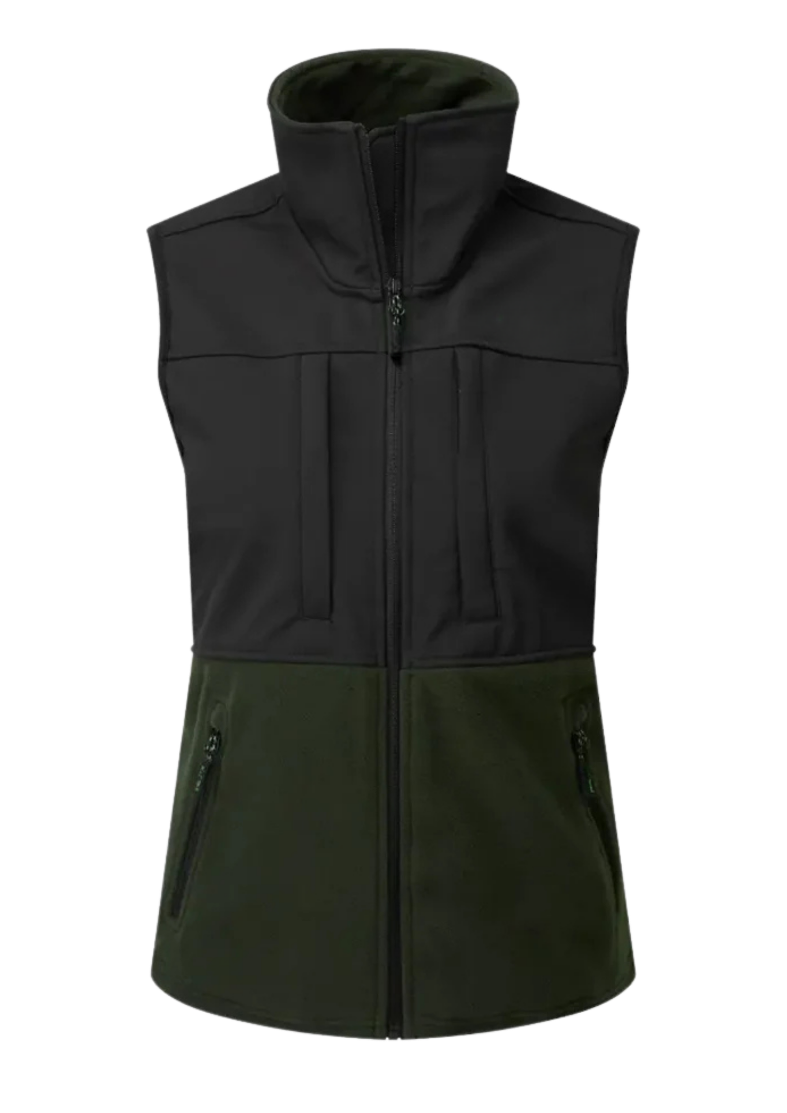 A functional sleeveless gilet/vest featuring a two-panel hybrid construction for versatile outdoor use. The design combines a weather-resistant upper panel with a warm fleece lower panel, making it a practical piece for outdoor sports, countrywear, and layering markets.