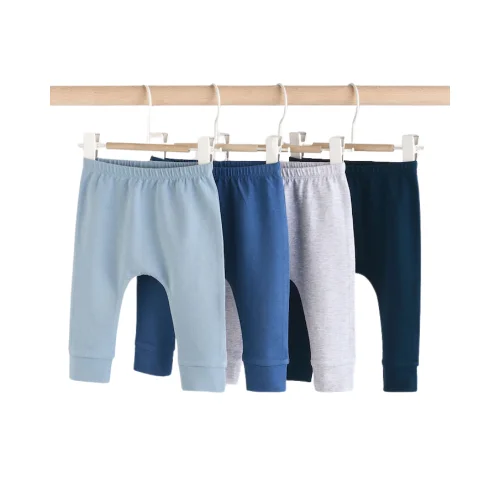 A multi-pack or set of soft, comfortable leggings/trousers designed for infants, featuring an elasticated waist and cuffed ankles. The set includes various shades of blue and a grey marle, making these an essential, everyday foundational piece for baby and children’s apparel markets.