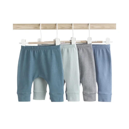 A multi-pack or set of soft, comfortable leggings/trousers designed for infants, featuring an elasticated waist and cuffed ankles. The set includes varied blue hues and a stripe pattern, making these an essential, everyday foundational piece for baby and children’s apparel markets.
