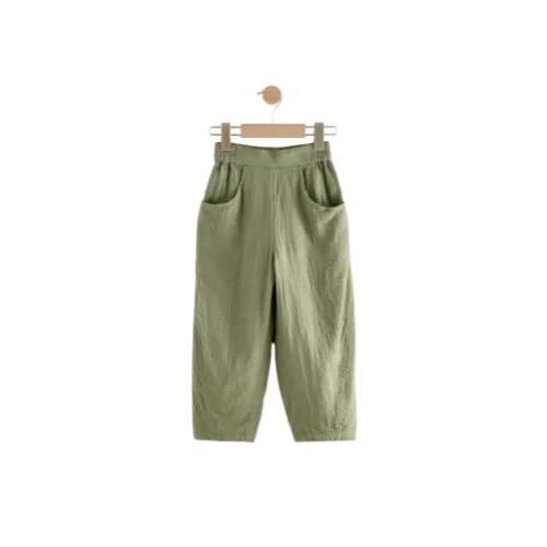 A pair of relaxed-fit trousers designed for infants/toddlers in a muted khaki green color. These trousers feature a gathered elasticated waist, deep side pockets, and a textured, crinkled fabric, offering an on-trend silhouette for children’s casualwear and loungewear markets.