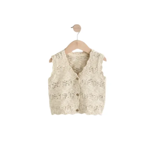 A charming, button-front knitted waistcoat or vest for infants/toddlers, constructed from a creamy white/natural yarn with an open lace or eyelet knit pattern. This lightweight layer features a scalloped hem and provides a delicate, classic look for children’s knitwear and heirloom-style apparel markets.
