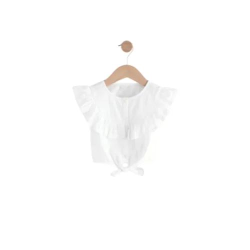 A crisp, white, sleeveless blouse designed for infants/toddlers, featuring a prominent ruffle-trimmed circular collar and a decorative tie-front knot detail at the hem. The button-front top has a slightly cropped or boxy fit, making it a sweet, classic piece for children’s casualwear, resort, and specialty apparel markets.