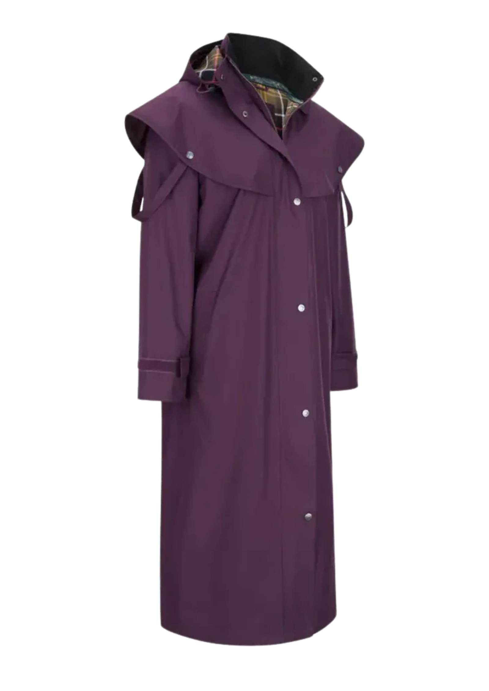 A heavy-duty, full-length waterproof coat in a striking deep purple/plum color, featuring traditional equestrian-inspired design elements like a cape yoke and storm flap. This style is engineered for maximum protection against the elements, making it ideal for countrywear, outdoor, and equestrian markets.