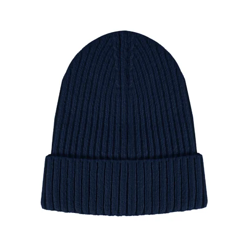 A classic, simple beanie or skull cap featuring a prominent vertical ribbed knit in a deep navy or midnight blue color. The knit structure is visible and consistent, indicating good warmth and stretch. The requested composition (50% Wool, 50% Polyamide) is a functional blend designed for a balance of natural warmth, durability, and shape retention. This accessory is suitable for unisex casual wear and outdoor/active accessories markets.