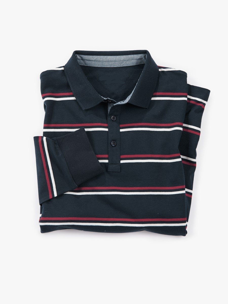 Classic long-sleeve polo in navy base with red and white horizontal stripes. A smart balance of heritage and comfort.