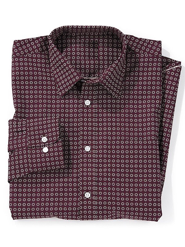 Patterned cotton shirt in rich wine tone featuring all-over geometric floral print for elevated casual and evening wear.