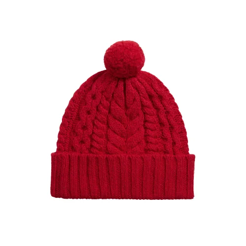 A classic, simple beanie or skull cap in a solid, bright red color, likely featuring a ribbed or fine knit structure. The image shows a heavily cabled knit structure with a pom-pom on top, suggesting a chunky and warm aesthetic. The requested composition (80% Merino Wool, 20% Nylon) ensures a blend of natural warmth, softness, and enhanced durability. This accessory is suitable for unisex casual, outdoor, and winter sports markets.