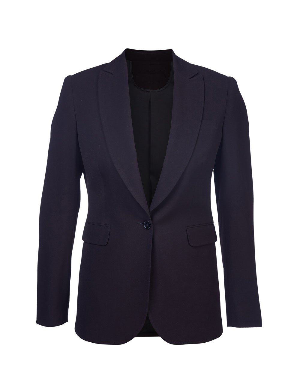 A sharp, tailored blazer in a professional navy or black color, designed with a classic lapel and single-button closure. Constructed from a stretch-infused blend, this jacket offers the polished look of suiting with enhanced comfort and mobility, ideal for corporate uniforms, business travel, or professional retail.