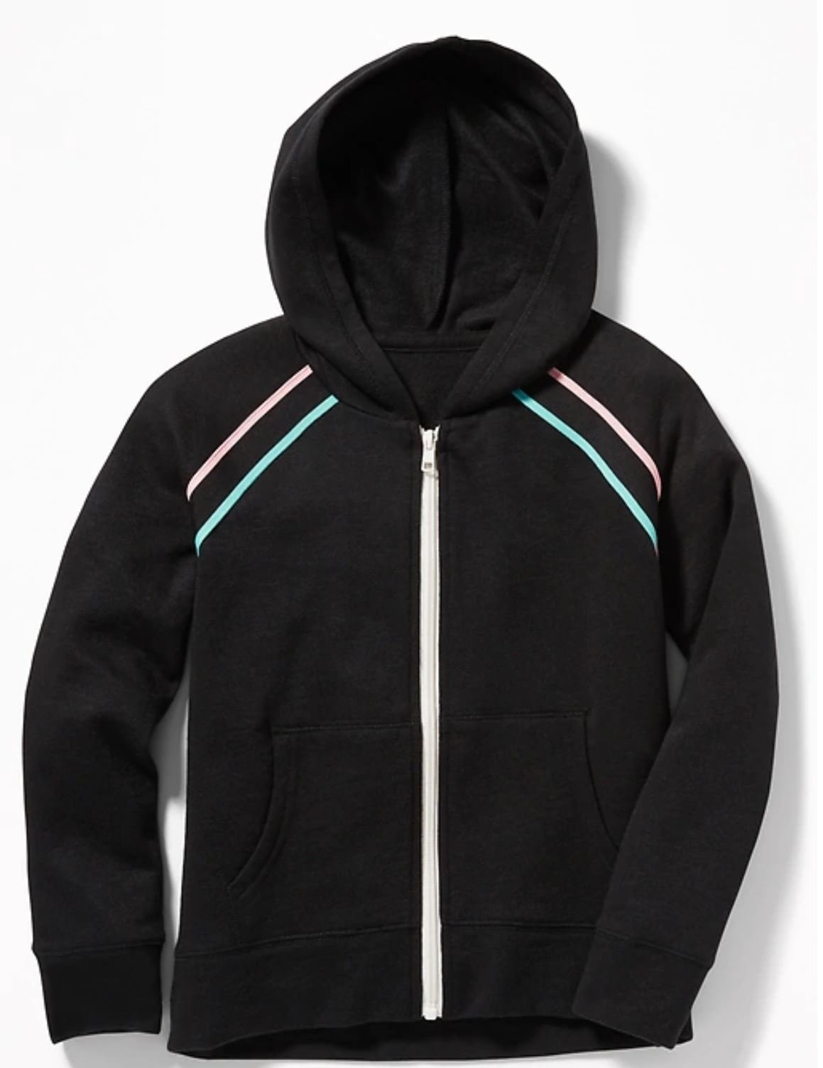 A soft, lightweight full-zip hoodie perfect for layering and year-round casual wear, featuring subtle contrast stripes on the shoulder for a playful, athletic touch. Designed for the youth/tween apparel market, it uses a comfortable cotton-rich slub knit that provides a cozy feel and modern texture.