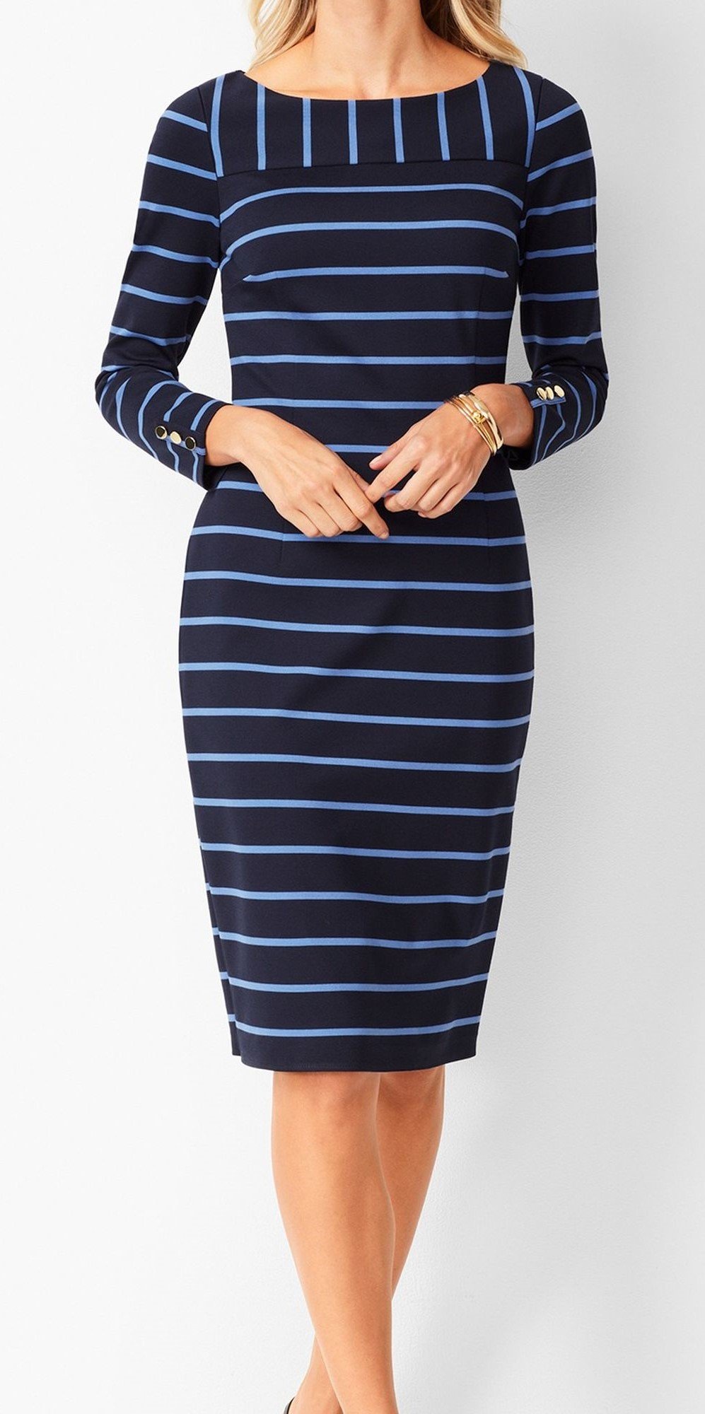 A sharp, knee-length sheath dress in a nautical-inspired navy and light blue horizontal stripe pattern. Constructed from a substantial ponte knit fabric with a smooth lining, this piece offers a tailored, flattering fit with comfortable stretch, perfect for business casual, resort wear, or contemporary retail collections.