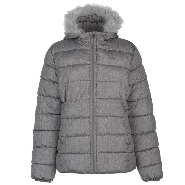 A warm, heavyweight puffer jacket in a stylish textured grey marl fabric. This jacket features horizontal baffle quilting for insulation, a detachable faux fur-trimmed hood, and a functional design, making it an essential piece of outerwear for casual, winter, and cold-weather outdoor apparel markets.