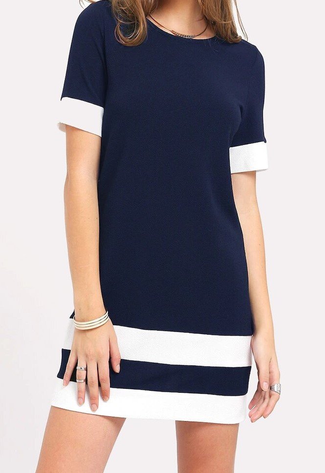 A fashionable, mini-length shift dress in a classic navy and white color-block design. Featuring clean, bold contrast trim at the sleeves and hem, this piece offers a preppy, retro-inspired aesthetic for the casual, contemporary, and fast-fashion markets.