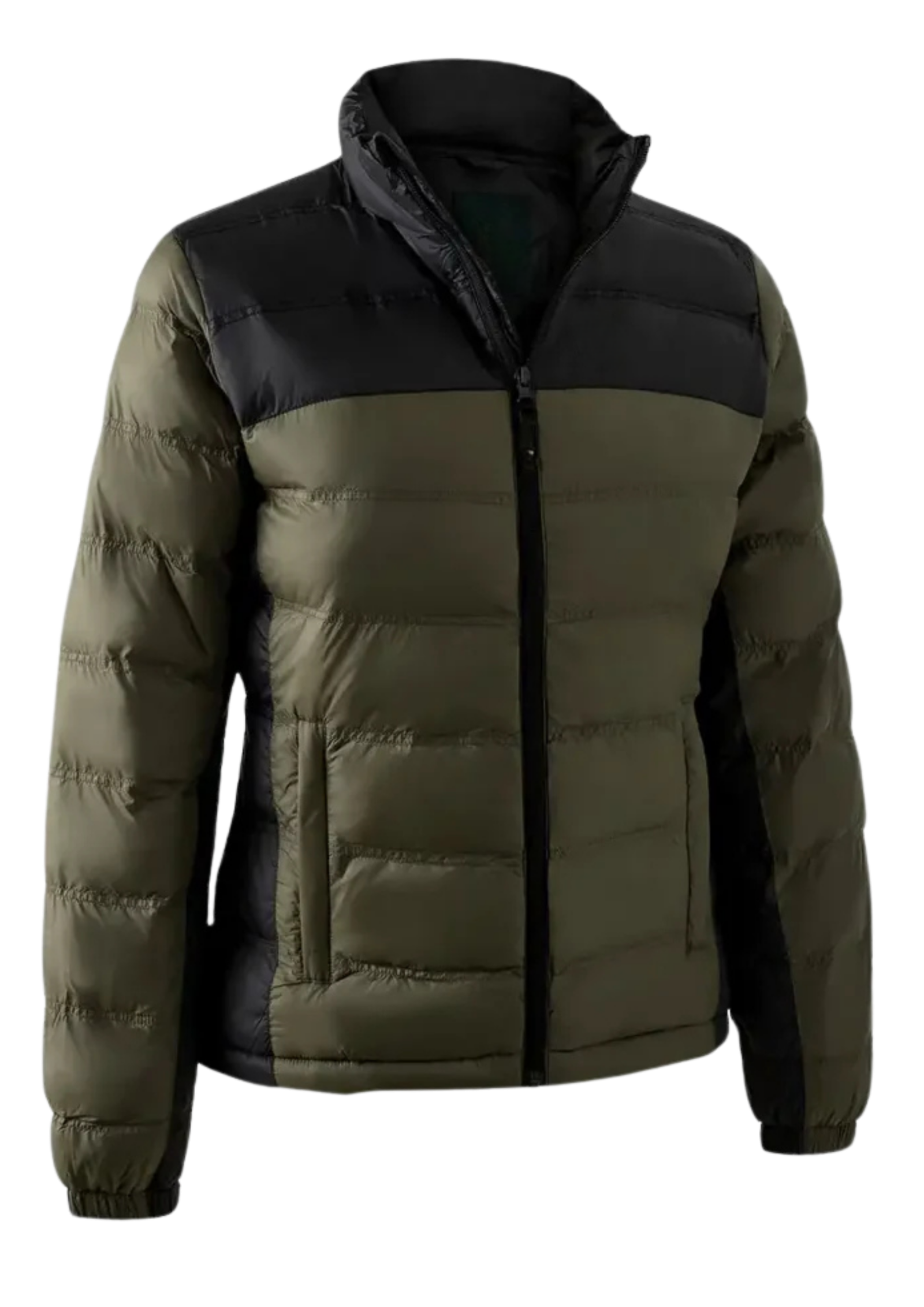 A short, quilted puffer jacket designed for lightweight warmth and insulation. The jacket features a two-tone color block design with an olive green body and black shoulder yoke, making it a functional and modern piece for casual outerwear, sports, and outdoor layering markets.